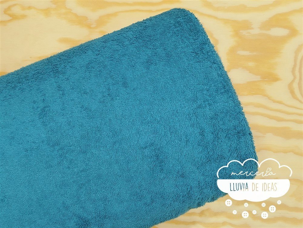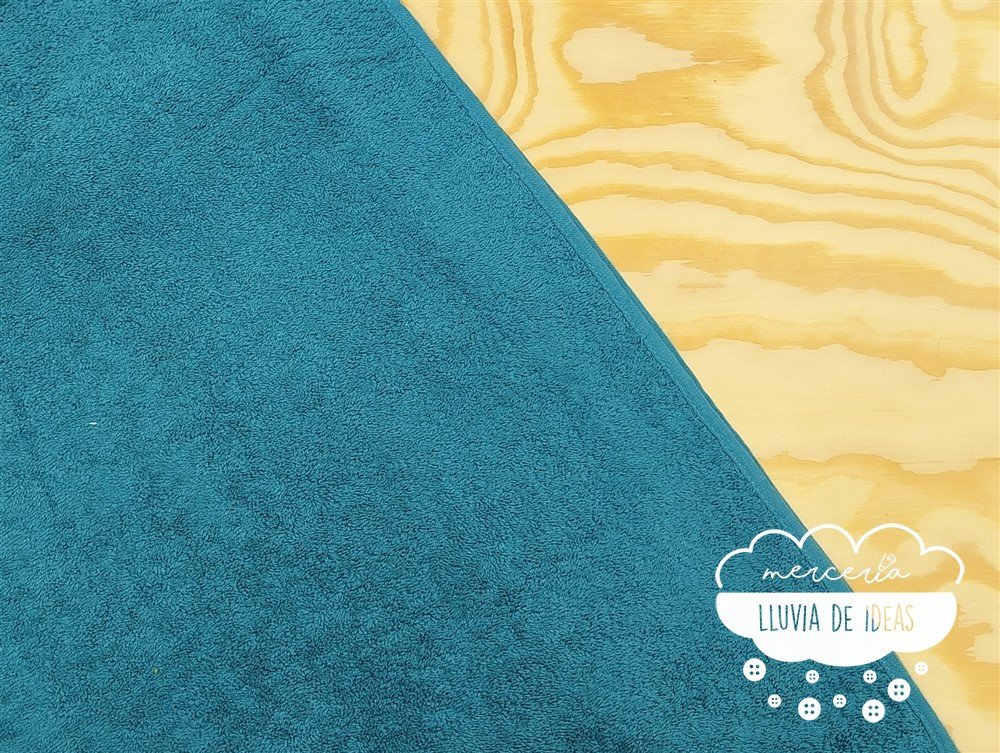 Rizo toalla verde pato 100% algodón. También llamado felpa o tela de toalla, de rizo americano, con mucho cuerpo, de tacto agradable. Gruesa y esponjosa. Viene rematada en los orillos. Es ideal para confeccionar toallas, arrullos y capas de baño, baberos, cambiadores, trapos de cocina, protectores, albornoces, etc.