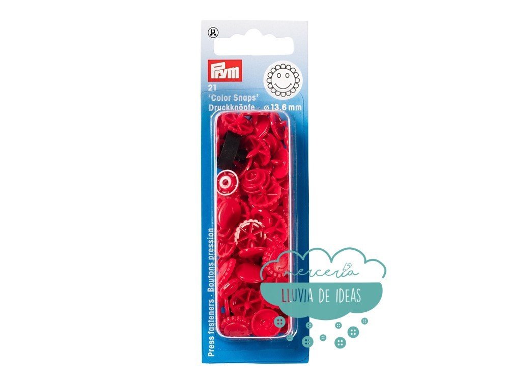 Botones de presión de plástico de 13,6 mm. de diámetro. Fabricados en plástico resistente, se pueden lavar a 60ºC. Son adecuados para cualquier tipo de textiles. Dale un toque alegre a tus proyectos con estos snaps en forma de flor sonriente. Para su aplicación es necesaria la tenaza Vario Prym Love 390901.