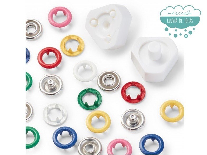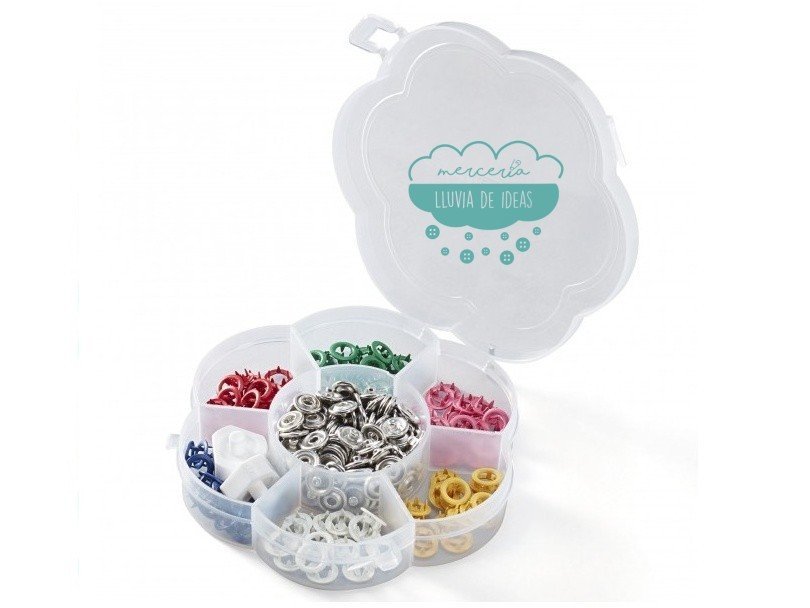 Cajita de plástico con forma de flor que incluye 60 botones a presión o snaps de Ø 8 mm. y los adaptadores para fijarlos. Indicados principalmente para tejidos finos y elásticos tipo jersey. Ideal para ropa de bebé o infantil.