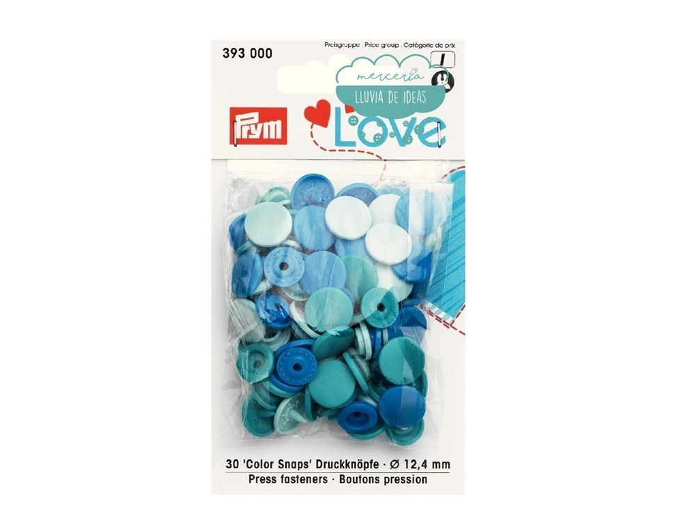 Botones de presión de plástico de 12,4 mm. de diámetro. Incluye los tonos aguamarina claro, aguamarina oscuro y turquesa oscuro.