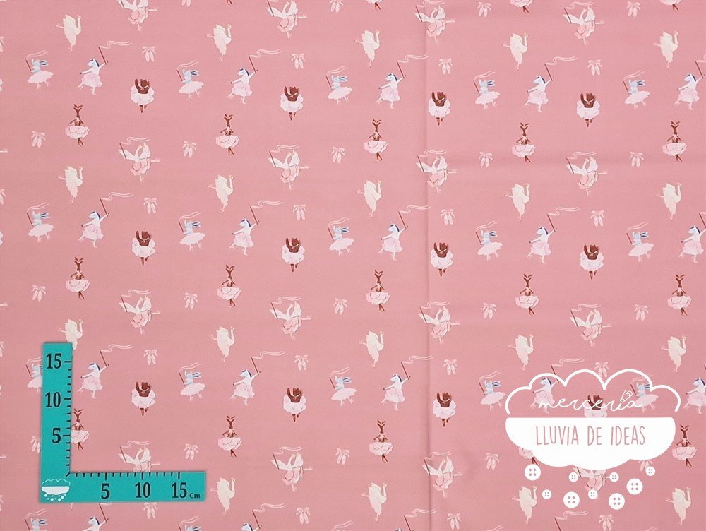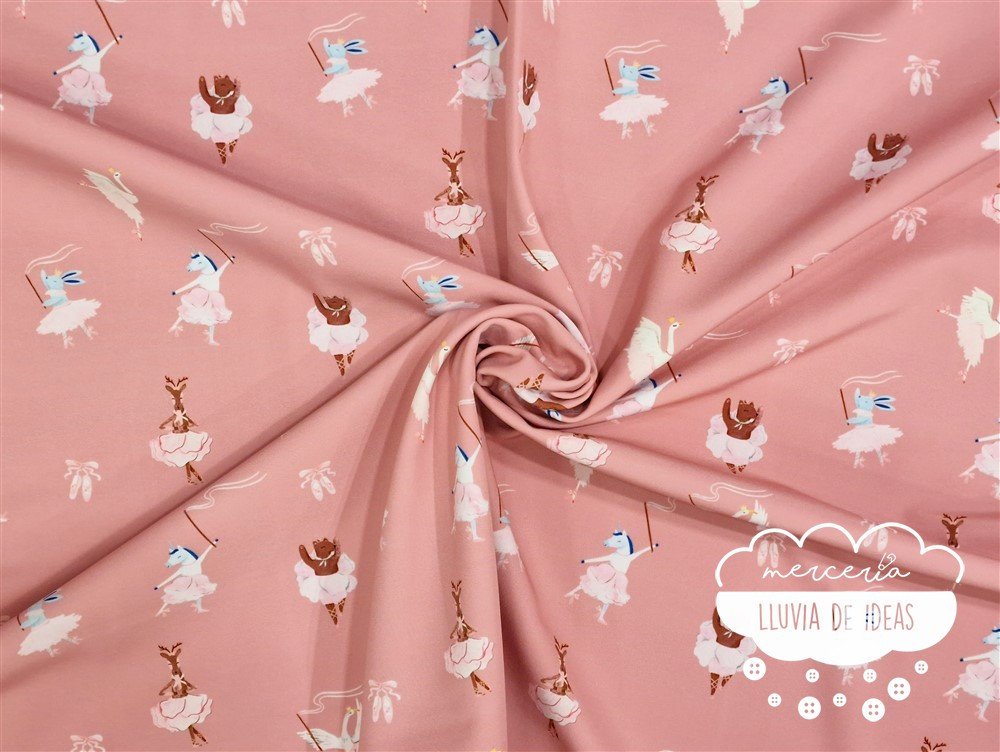 Tela softshell con estampación digital en fondo rosa con tiernos animales vestidos de bailarinas, indicada para la confección de prendas y accesorios o complementos tanto de niños como de adultos. Con este tejido podrás crear infinidad de proyectos resistentes como chaquetas, parkas o kanguros, sacos de silla de paseo para bebé, etc. consiguiendo prendas muy funcionales y prácticas. Tejido con cuerpo pero relativamente ligero, formado por varias capas de tela donde cada una, cumple una función específica: la parte exterior que protege del viento y de la lluvia, y la parte interior que protege del frío. De ahí su nombre en inglés "softshell" (caparazón blando en castellano). Es repelente al agua.
