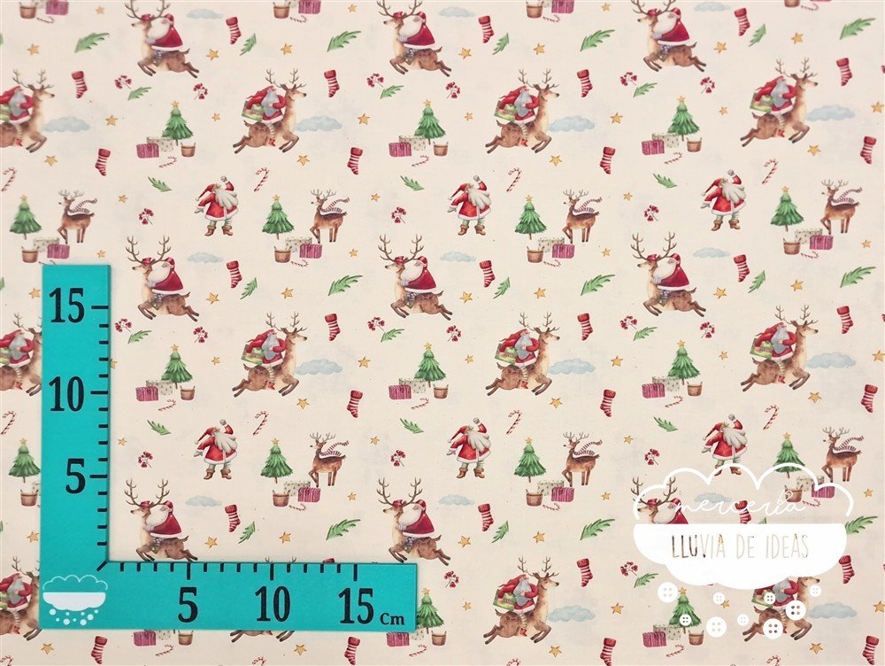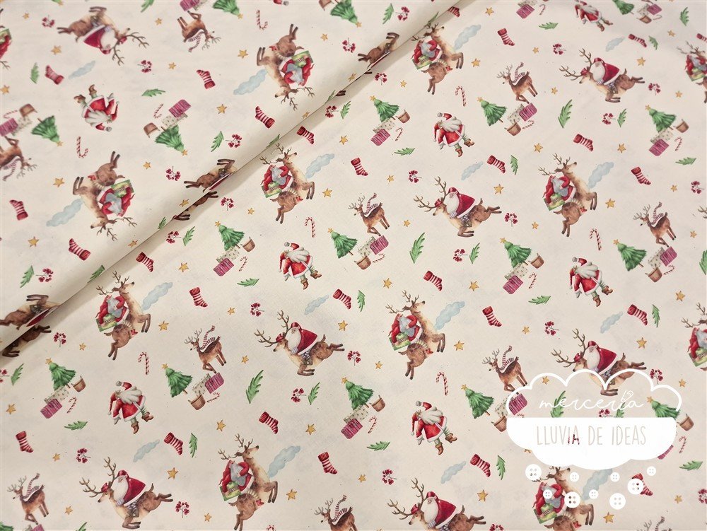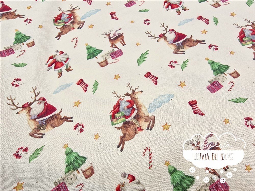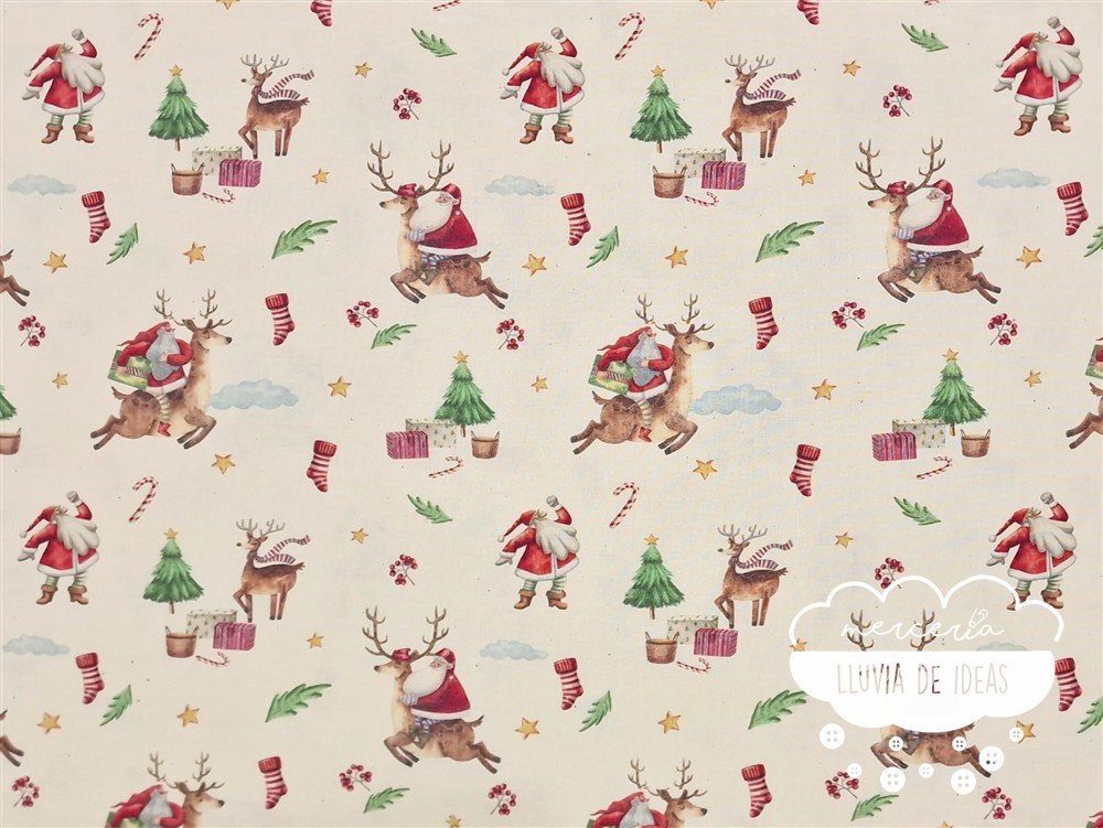Tela de algodón Navidad. La estampación contiene a Papá Noel realizando diferentes actividades, con decoración de ciervos, abetos, acebos, etc. sobre fondo crudo. De tacto suave y agradable, resulta ser un tejido muy versátil. Ideal para proyectos de confección decorativos navideños.