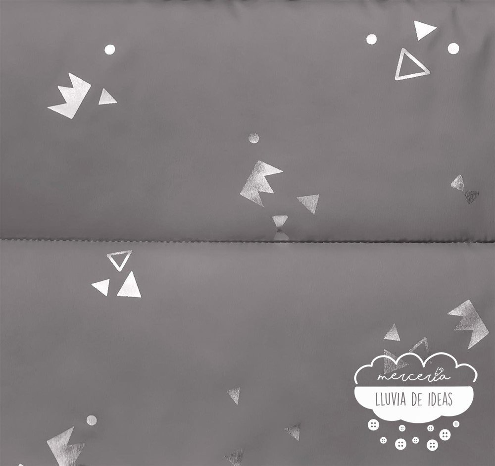 Tela acolchada "Padded Silver Print" de Katia Fabrics, diseñada en fondo de tonos lisos: rosa, mostaza y gris. Contiene detalles metalizados en tonos plata de coronas y triángulos que le aportan un toque "chic" y juvenil al mismo tiempo.