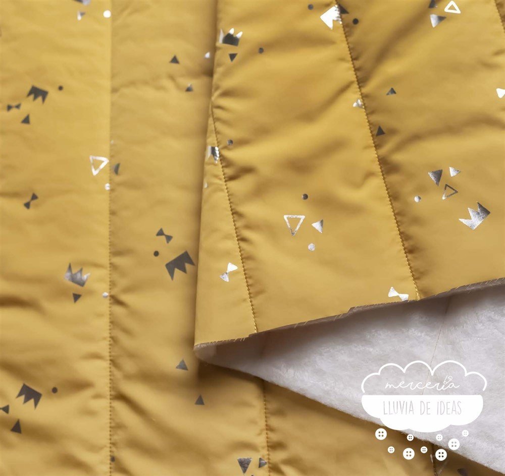 Tela acolchada "Padded Silver Print" de Katia Fabrics, diseñada en fondo de tonos lisos: rosa, mostaza y gris. Contiene detalles metalizados en tonos plata de coronas y triángulos. Resulta perfecta para confeccionar prendas de abrigo como chaquetas, chalecos, anoraks, bombers o abrigos acolchados. Podrás emplearlo tanto para crear prendas infantiles (y complementos: sacos, bolsas de maternidad, neceseres, mantas acolchadas, etc.) como para adultos. Este acolchado te aísla del frío por lo que está indicado para la temporada de otoño/invierno. Resistente y duradero.