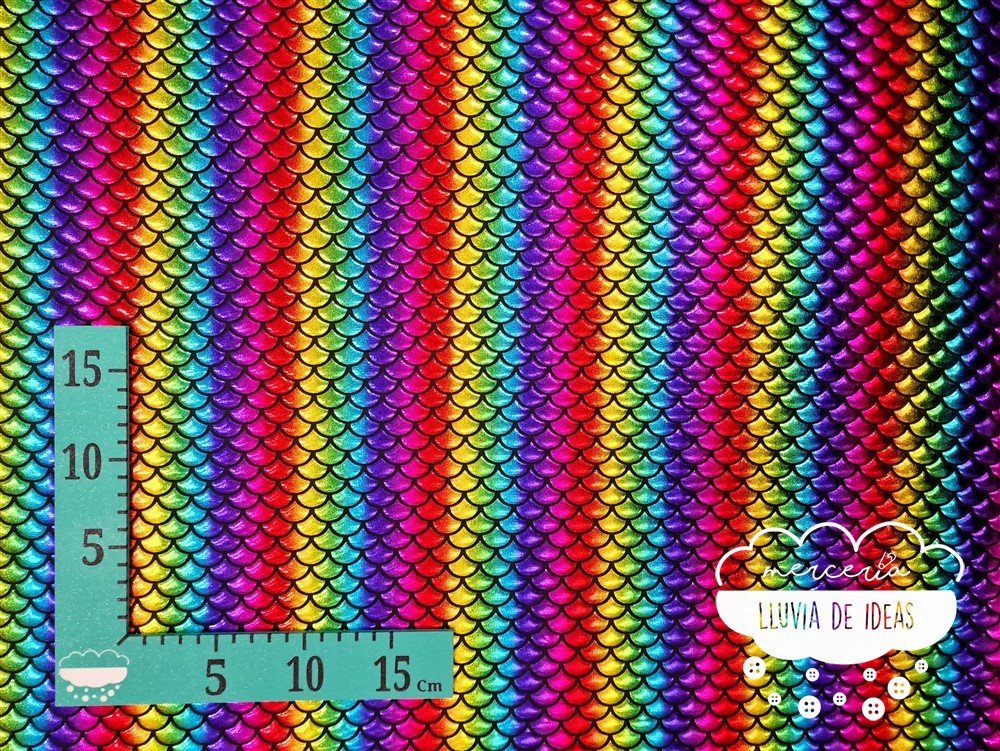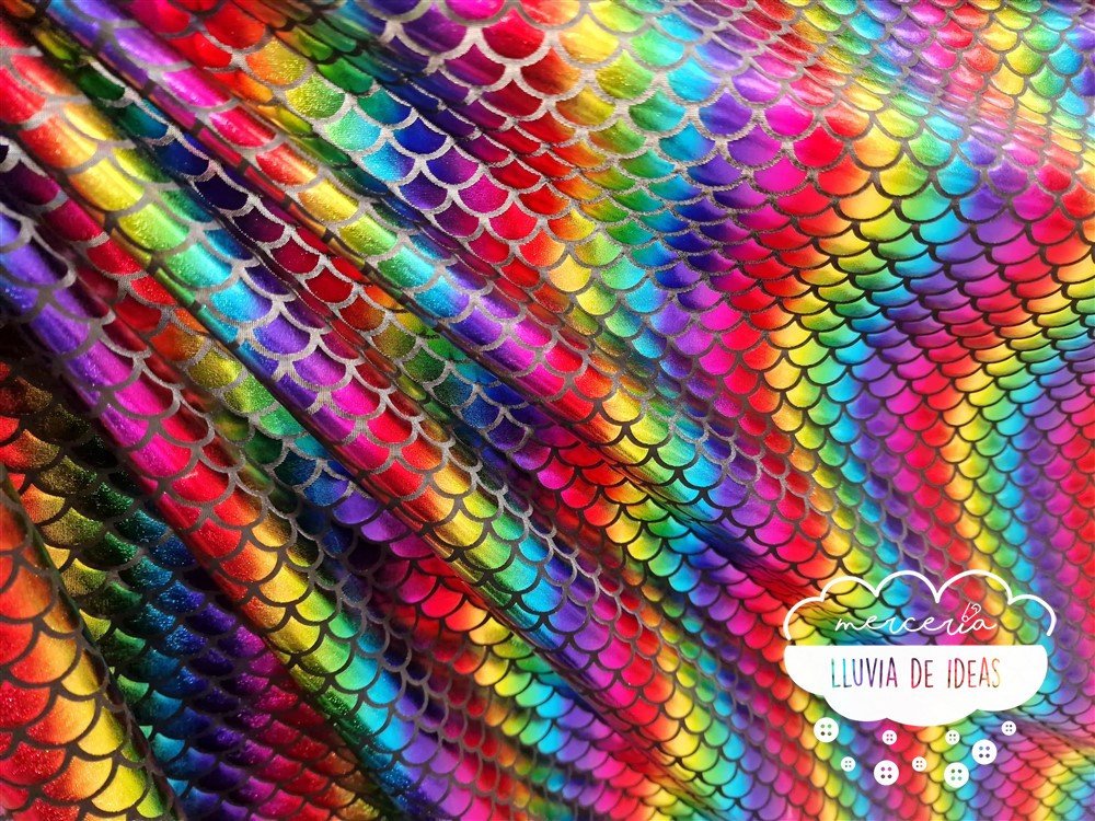 Punto lycra multicolor con efecto de escamas que recuerdan a los peces y sirenas. Tejido elástico de punto de lycra en color negro con escamas sobrepuestas similares al vinilo en tonos arcoíris. Con cierto cuerpo y muy buena caída. Tacto agradable y aspecto vistoso. Estira tanto a lo ancho como a lo largo del tejido. Se emplea principalmente en la confección de disfraces, maillots, danza, ropa de baño, trajes de competición, etc.