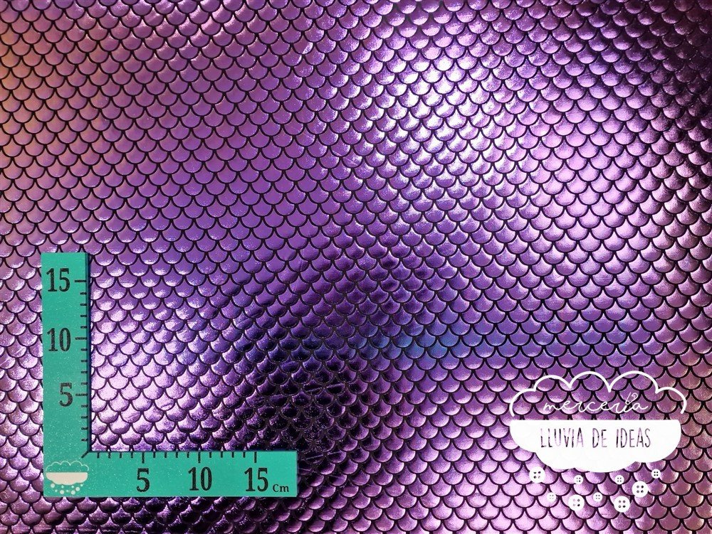 Punto lycra con efecto de escamas que recuerdan a los peces y sirenas. Tejido elástico de punto de lycra en color negro con escamas sobrepuestas similares al vinilo en tonos violeta y dorado iridiscentes. Con cierto cuerpo y muy buena caída. Tacto agradable y aspecto vistoso. Estira tanto a lo ancho como a lo largo del tejido. Se emplea principalmente en la confección de disfraces, maillots, danza, ropa de baño, trajes de competición, etc.