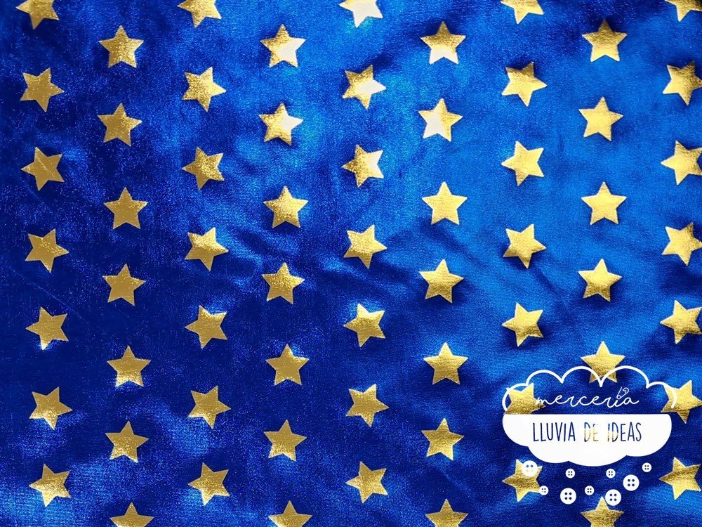 Punto lycra estrellas doradas con fondo azulón. Tejido elástico de punto de lycra metalizado. Con cierto cuerpo y muy buena caída. Tacto agradable y aspecto vistoso. Estira tanto a lo ancho como a lo largo del tejido. Se emplea principalmente en la confección de disfraces, maillots, danza, ropa de baño, trajes de competición, etc.