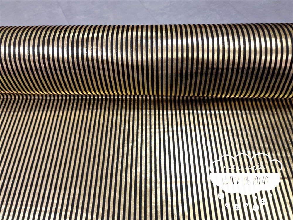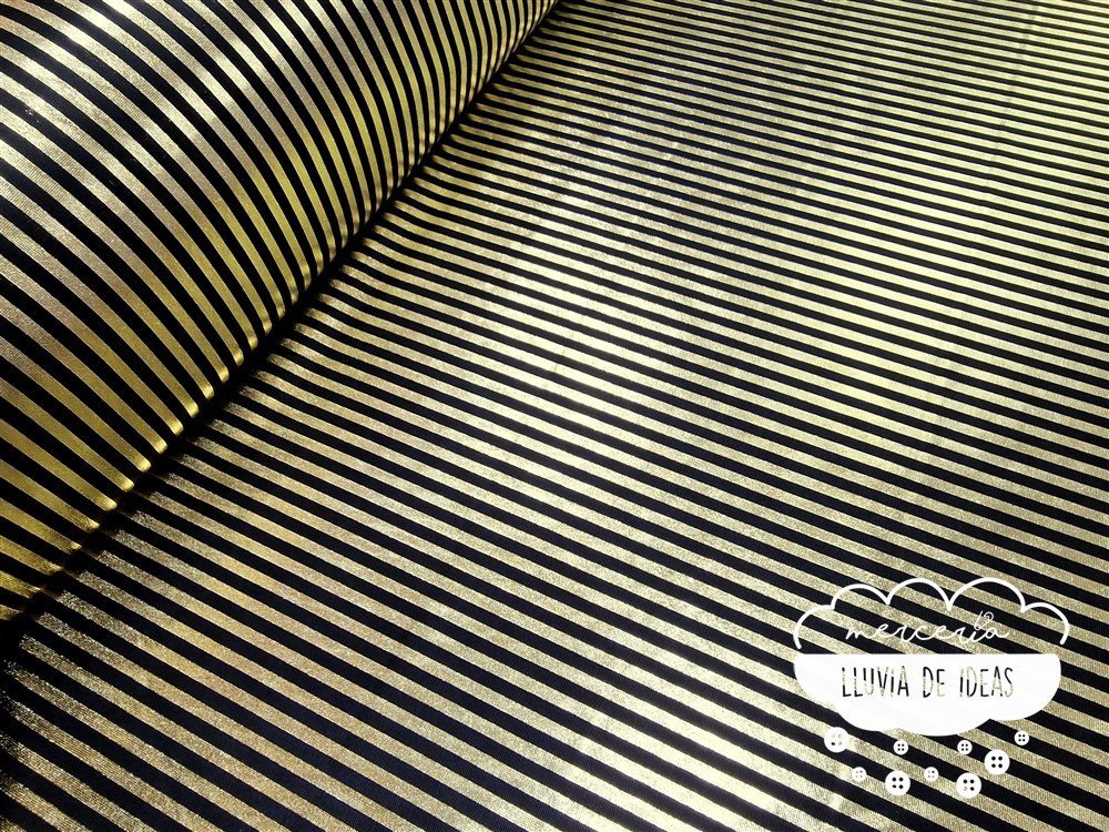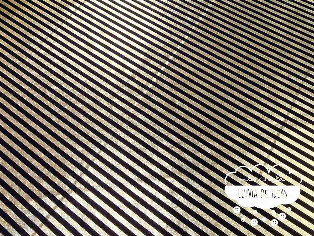 Punto lycra de rayas doradas y negras. Tejido elástico de punto de lycra metalizado. Con cierto cuerpo y muy buena caída. Tacto agradable y aspecto vistoso. Estira tanto a lo ancho como a lo largo del tejido.