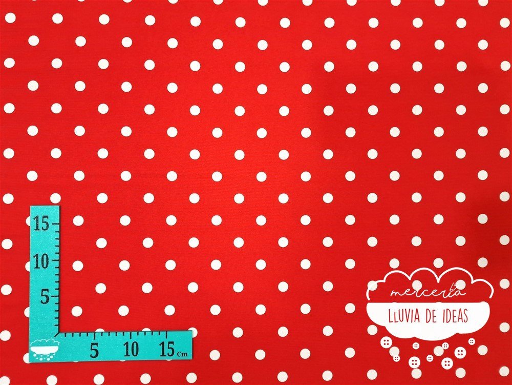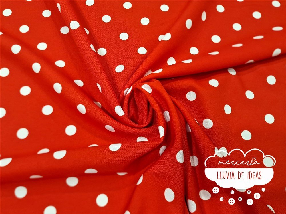El stretch lunares blanco sobre fondo rojo es un tejido de poliéster, una tela plana semejante al crep, con un grosor medio y con caída. Es bastante tupido aunque no es totalmente opaco, pero no suele ser necesario forrarlo por posibles transparencias (en confección de moda siempre será recomendable por comodidad). Apenas notarás diferencia entre la cara buena y su revés ya que son muy similares.
