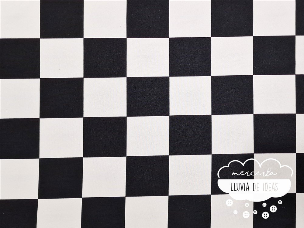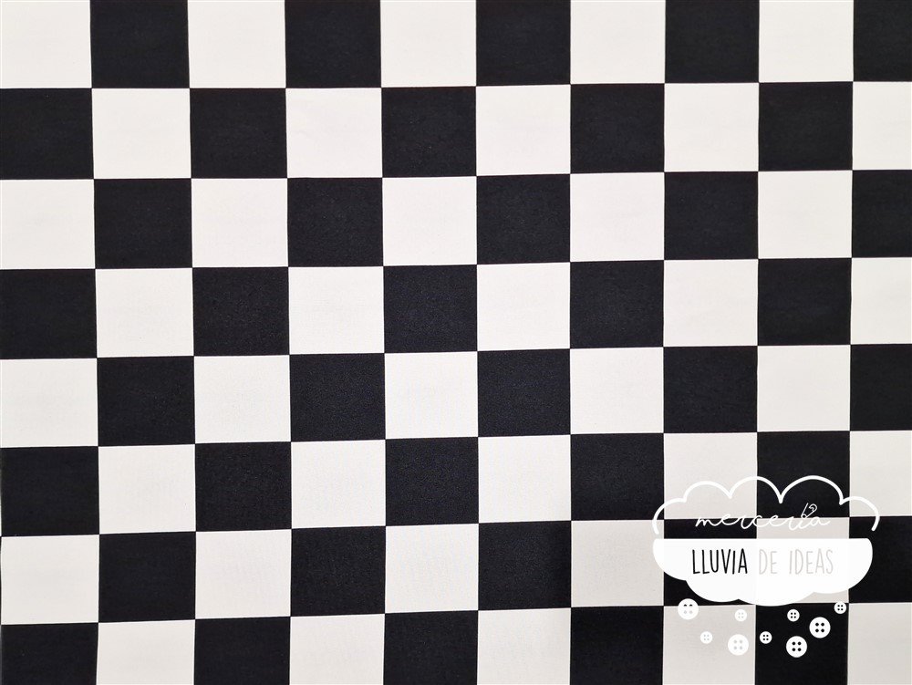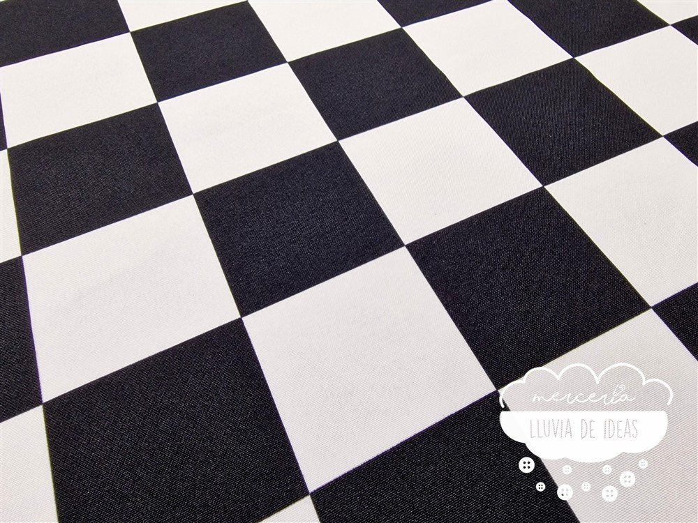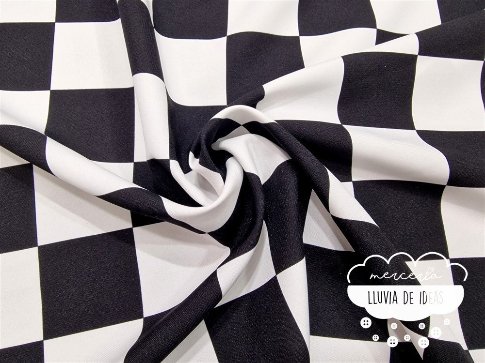 El stretch bandera de cuadros o ajedrez es un tejido de poliéster, una tela plana semejante al crep, con un grosor medio y con caída. Es bastante tupido aunque no es totalmente opaco, pero no suele ser necesario forrarlo por posibles transparencias (en confección de moda siempre será recomendable por comodidad). Apenas notarás diferencia entre la cara buena y su revés ya que son muy similares.