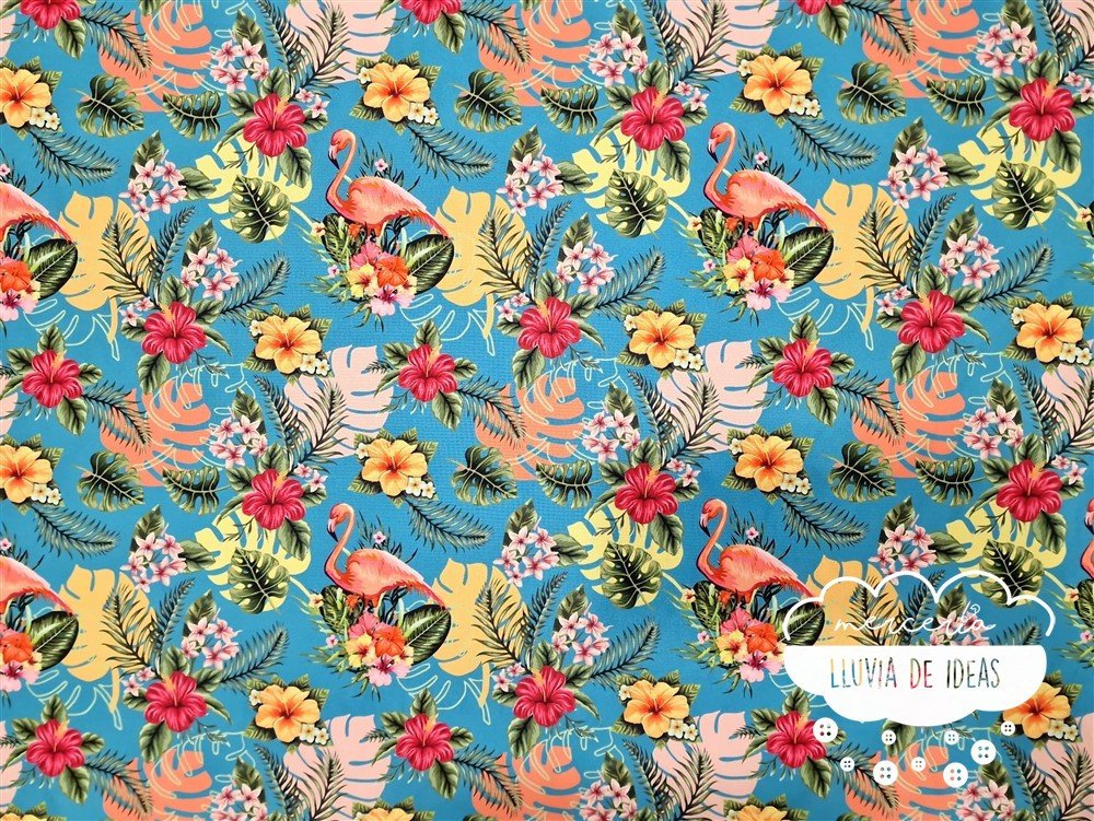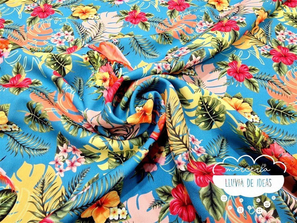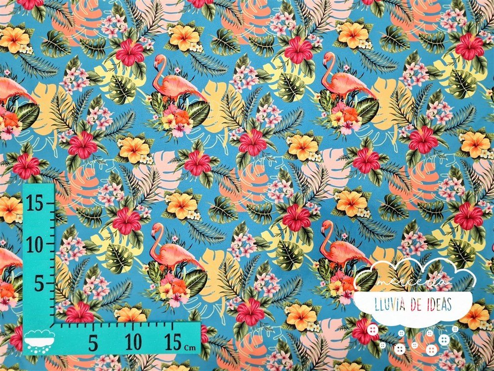 El stretch Flamencos tropical es un tejido de poliéster, una tela plana semejante al crep, con un grosor medio y con caída. Es bastante tupido aunque no es totalmente opaco, pero no suele ser necesario forrarlo por posibles transparencias (en confección de moda siempre será recomendable por comodidad). Apenas notarás diferencia entre la cara buena y su revés ya que son muy similares.