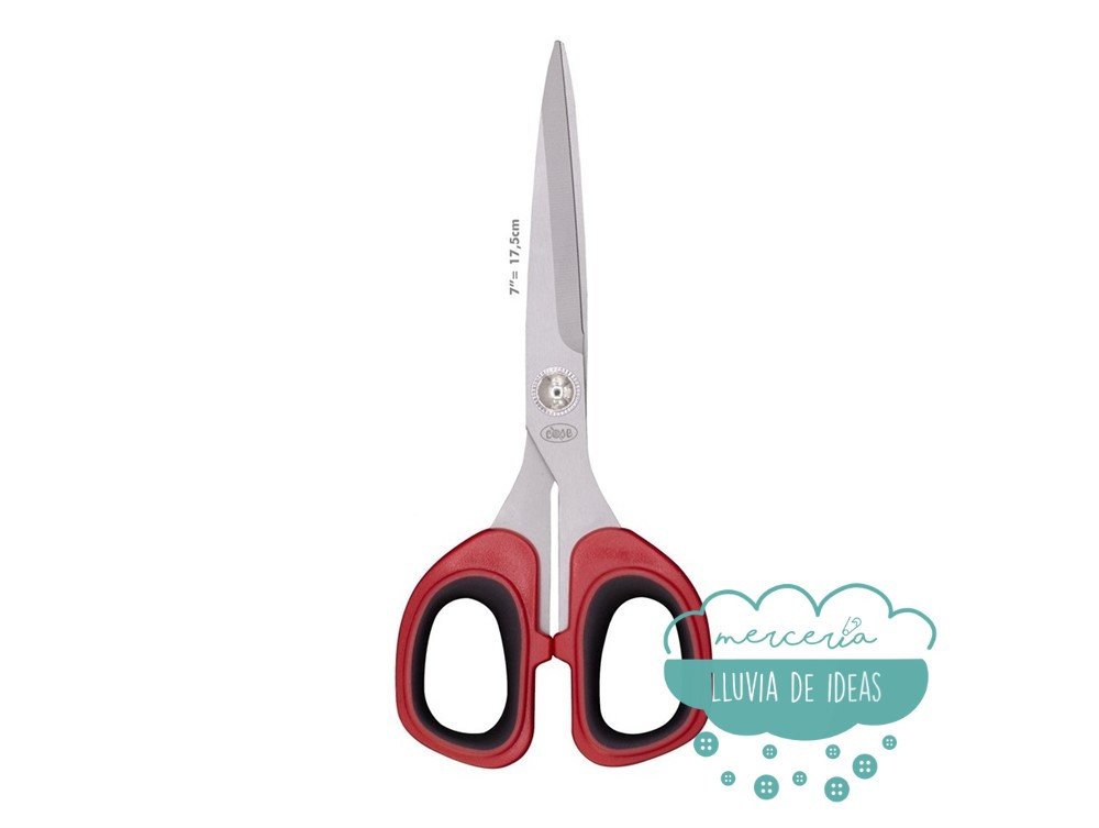 Tijeras de 18 cm. de largo total aproximadamente. Indicadas para la confección, ya que cortan de manera fácil varias capas de tela al mismo tiempo por sus cuchillas afiladas de acero inoxidable y su increíble precisión. Incluye mango suave en rojo y negro.