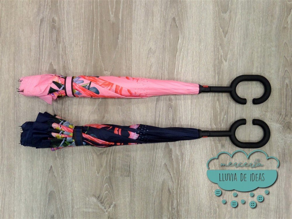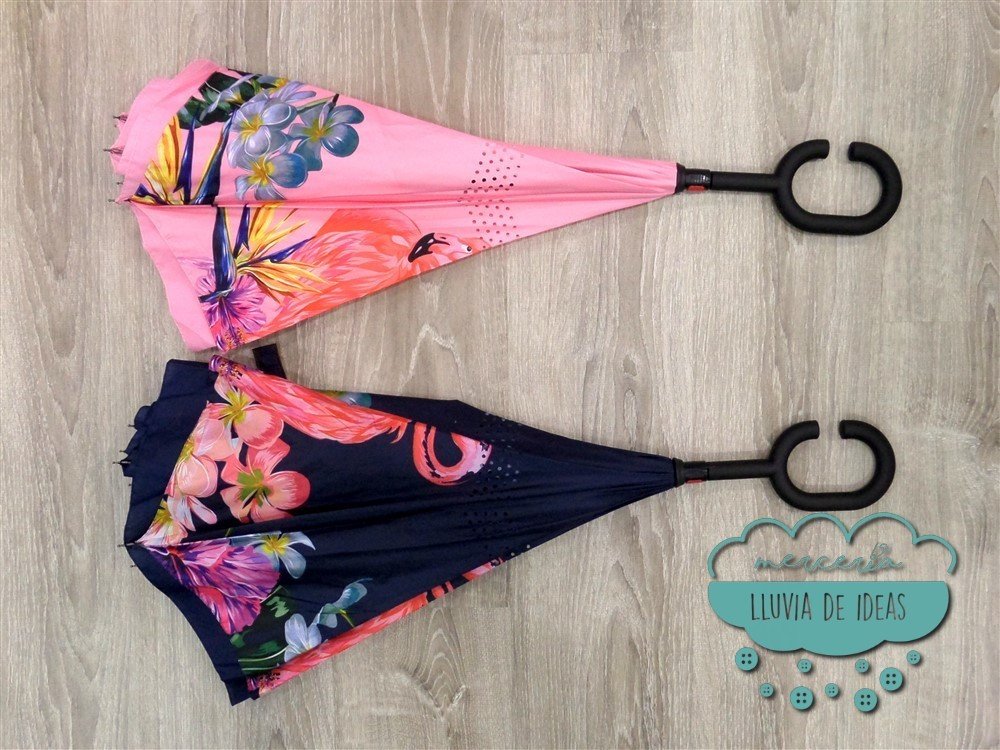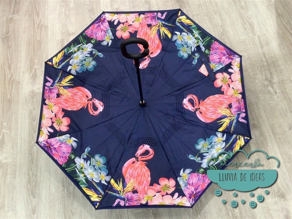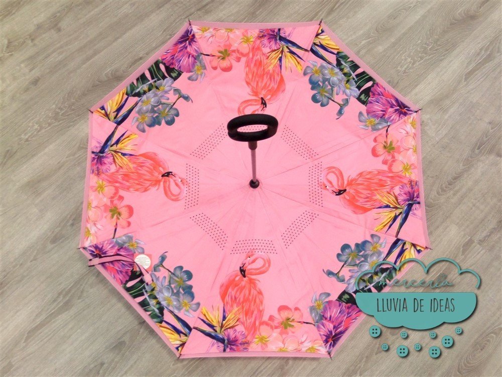 Paraguas invertido de doble tela con estampación de flores y flamencos la cual queda en la parte interior al abrirlo. Cuando está cerrado las varillas actúan como soporte y hacen que el paraguas se mantenga de pie. Al tratarse de un paraguas invertido una vez usado se cierra por el lado seco y evita que te mojes. Su mango con forma de "C" facilita que puedas llevarlo del brazo apoyado en un hombro para tener las manos libres.