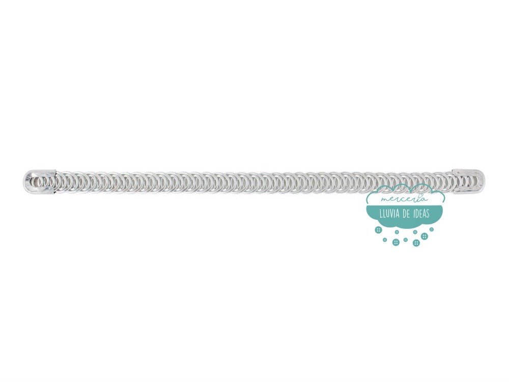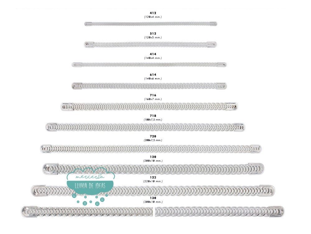 Ballena de metal en espiral. Este tipo de varillas metálicas con forma de espiral se emplean principalmente en corsés. Incluyen cubierta o carcasa en los extremos para cubrir el metal y evitar roces. Muy versátiles, mantienen la forma y permiten adaptarse ligeramente tanto de izda. a dcha. como de adelante hacia atrás. Se colocan verticalmente para mantener la tensión y cuerpo del corsé evitando cualquier tipo de arruga. Consiguen realzar la figura y perfilar la silueta.