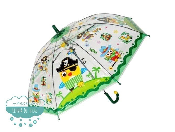 Paraguas transparente de plástico para niños con estampación de piratas y otros motivos. Apertura automática. 8 varillas. Mango de plástico.