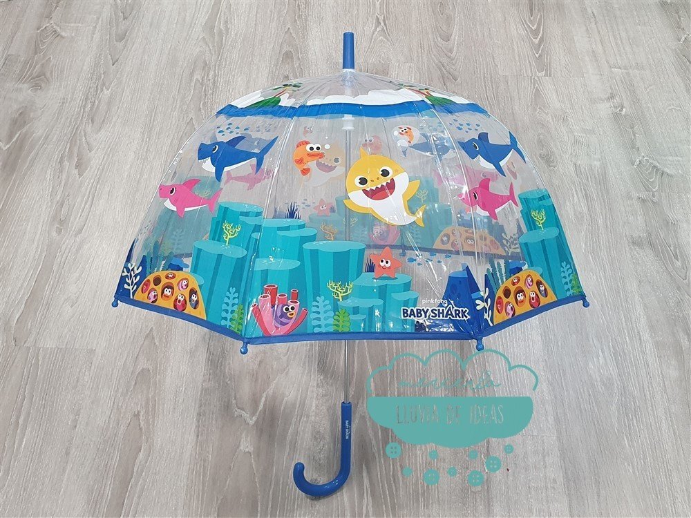 Paraguas transparente de plástico para niños con estampación de Baby Shark. Apertura manual. 8 varillas. Mango de plástico. Forma de seta.